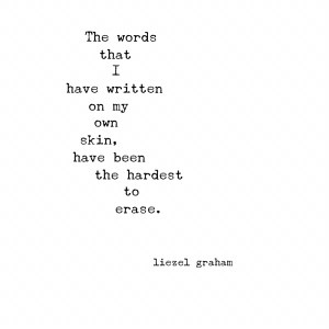 poetry and writings / the basket of random posts filled with beauty I am (rewriting) myself. August 9, 2018 liezel grahamLeave a comment The words that I have written on my own skin, have been the hardest to erase. — I am (rewriting) myself. Share Click to share on X (Opens in new window) X Click to share on Facebook (Opens in new window) Facebook Click to email a link to a friend (Opens in new window) Email Click to print (Opens in new window) Print Click to share on LinkedIn (Opens in new window) LinkedIn Click to share on Pinterest (Opens in new window) Pinterest Click to share on WhatsApp (Opens in new window) WhatsApp Click to share on Reddit (Opens in new window) Reddit More Click to share on Telegram (Opens in new window) Telegram Like Loading...