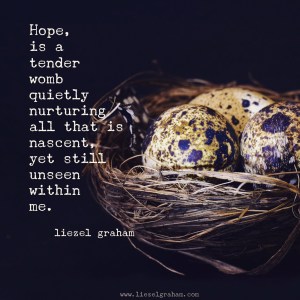 poetry and writings / the basket of random posts filled with beauty Nascense. August 22, 2018 liezel grahamLeave a comment Hope, is a tender womb quietly nurturing all that is nascent, yet still unseen within me. — Nascense. Share Share on X (Opens in new window) X Share on Facebook (Opens in new window) Facebook Email a link to a friend (Opens in new window) Email Print (Opens in new window) Print Share on LinkedIn (Opens in new window) LinkedIn Share on Pinterest (Opens in new window) Pinterest Share on WhatsApp (Opens in new window) WhatsApp Share on Reddit (Opens in new window) Reddit More Share on Telegram (Opens in new window) Telegram Like Loading...