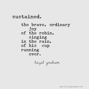 poetry and writings sustained. October 8, 2018 liezel grahamLeave a comment the brave, ordinary joy of the robin, singing in the rain, of his cup running over. — sustained. © Liezel Graham 2018. Share Click to share on X (Opens in new window) X Click to share on Facebook (Opens in new window) Facebook Click to email a link to a friend (Opens in new window) Email Click to print (Opens in new window) Print Click to share on LinkedIn (Opens in new window) LinkedIn Click to share on Pinterest (Opens in new window) Pinterest Click to share on WhatsApp (Opens in new window) WhatsApp Click to share on Reddit (Opens in new window) Reddit More Click to share on Telegram (Opens in new window) Telegram Like Loading...
