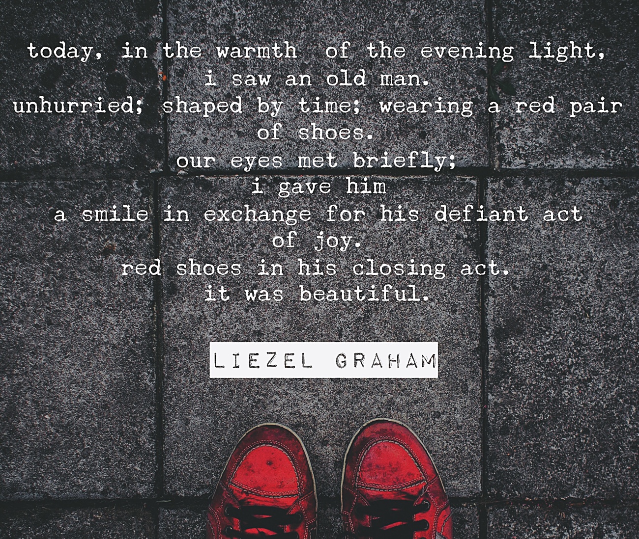As our eyes met — and it was just the briefest connection in time — I smiled at him. A gift, in exchange for this unexpected, wild delight of a man in the final act of his life, owning the sidewalk in his red shoes.