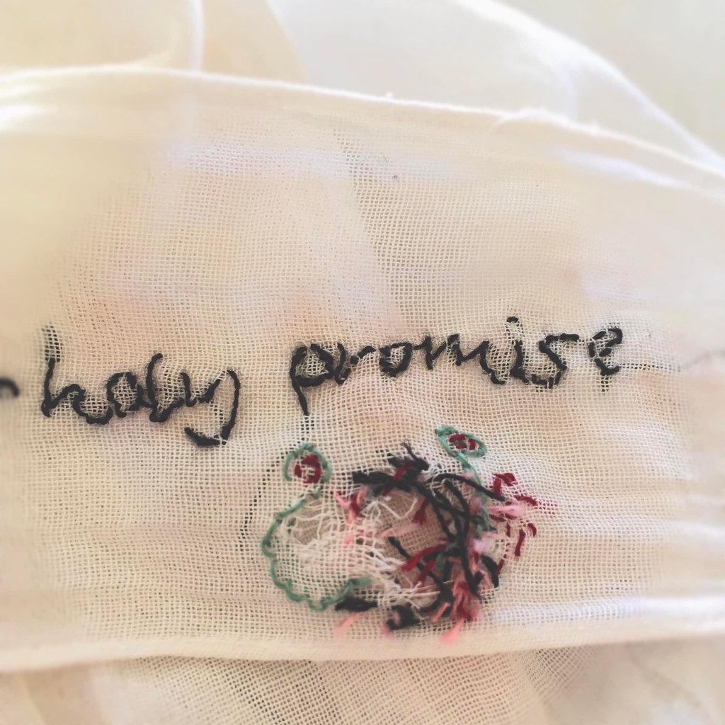 {My stitching project, Words with Elizabeth, is about domestic violence. I am combining my poetry with stitching and using vintage clothing as my canvas. This is a line from a poem that was published by Brenda Magazine a few years ago. At this point I am not sure where it will take me, but I am doing it with the intention of sending healing out into the ether}