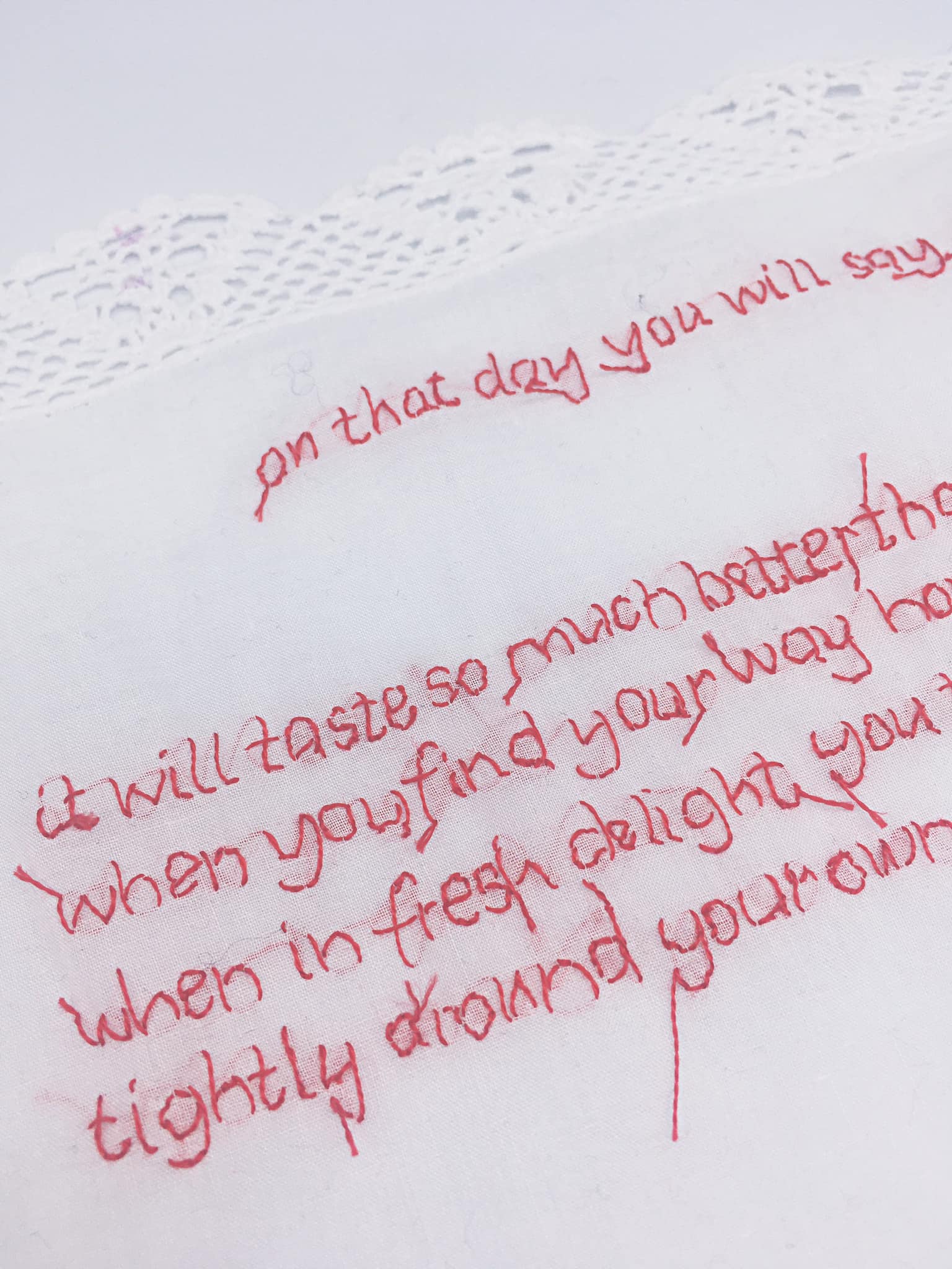 A self-taught ‘creative’, I explore the world that I dwell in through the use of narrative stitching and vintage textiles. Stitching my words onto fabric brings me healing and a deep sense of purpose and belonging.